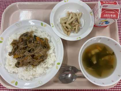 今日の豚キムチ丼はピリッとした辛さでとても人気がありました。じゃがいもの胡麻和えには、練り胡麻や砂糖を使っているためか、濃厚なごま味がおいしいと好評でした。