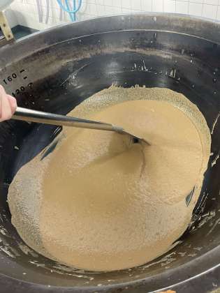 写真の1枚目は、ハンガリアンシチューのルゥを作っているところです。バターで小麦粉を炒めて、少し色づいてきたところです。