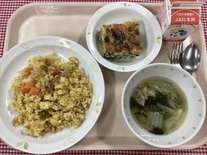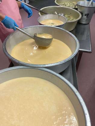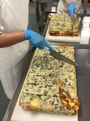 卵焼きは、炒めた具と卵などの液体をそれぞれ測り、合わせて焼いています。今日は分厚い卵焼きができあがりました。チーズなども入っていて、濃厚でおいしい味わいに仕上がりました。