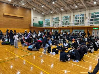 たった今宿舎に到着し、体育館に整列をしているところです!