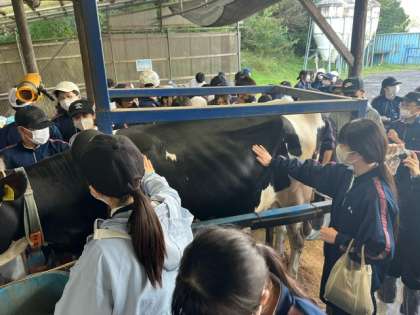 本物の牛の手触りにみんな興奮しています。(松坂)