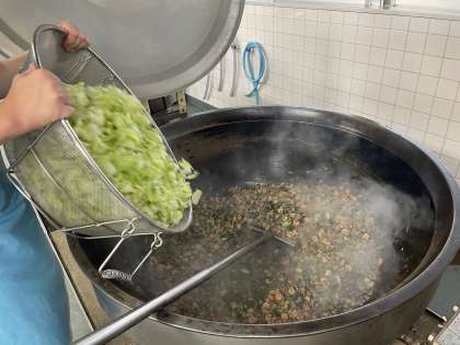 チャーハンにはレタスが入っていました。できるだけシャキシャキ感を残すため、一番最後に加えています。にゅうめん汁は、本の中では出汁を鰹節と昆布からしっかり取り、具はねぎとそうめんだけのシンプルなものでしたが、給食では野菜や豆麩も入った具だくさんな汁にしています。