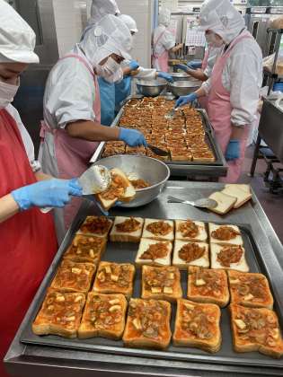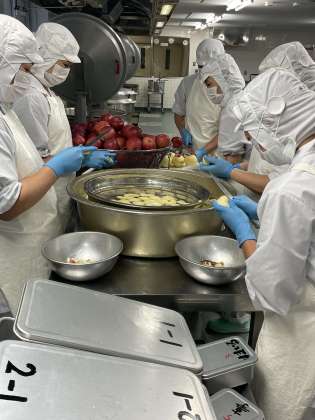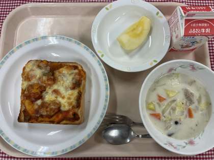 ピザトーストの具やチーズをのせたり、りんごの皮を剥いたり、作業が多く大変でしたが、みんなおいしく食べてくれました。