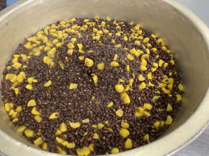 また、デザートの栗あん団子は、小豆から丁寧に煮てくれています。栗はターメリックで色よく煮て、餡と合わせました。