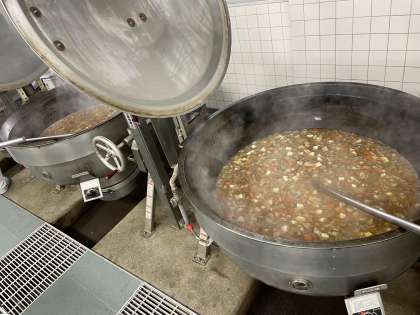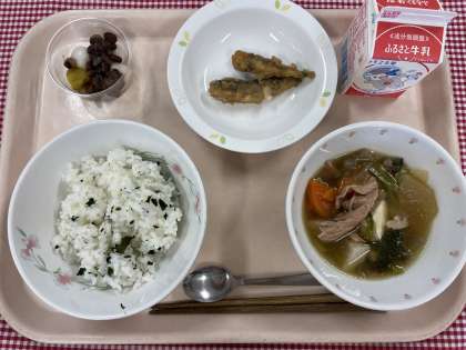 山形県の秋の風物詩といえば、河川敷での「芋煮会」です。河原などの野外にグループで集まり、里芋が主役の鍋料理を作ります。給食でも大きな釜2つを使って、芋煮風を作りました。