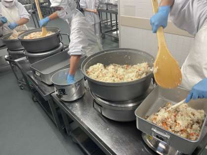 鮭ピラフは、具材を炒めた後、炊きあがったお米に混ぜ込んで作っています。量が多く大変ですが、丁寧に混ぜてくださいました。