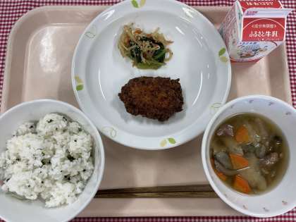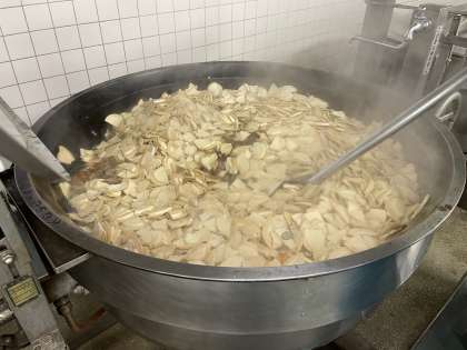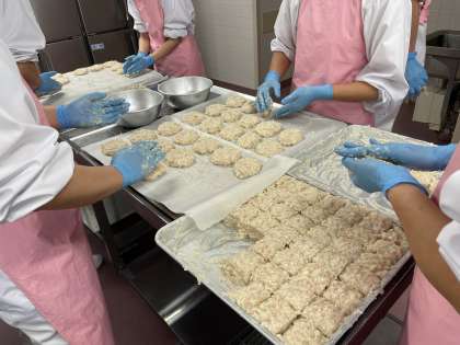 イカメンチは、イカのミンチに野菜など他の具材を混ぜ合わせてから揚げて作ります。せんべい汁は、汁の最後に南部せんべいを入れて仕上げます。配缶してからどうしても時間が経ってしまいますが、もちもちしてとても人気がありました。