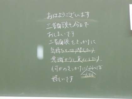 今日で三者面談が終わります。ご多用の中、ご来校いただきありがとうございました。三者面談は、学校生活での良いところや課題を確認して次に進むための作戦会議だと思っています。ここまでを振り返り、前進していきましょう。