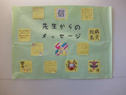 西階段に3年生に向けての先生方からのメッセージが貼ってありました。いよいよ受験シーズンが始まります。一番大切なのは健康です。きちんとした生活をして、試験に臨んでください。応援しています!