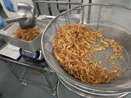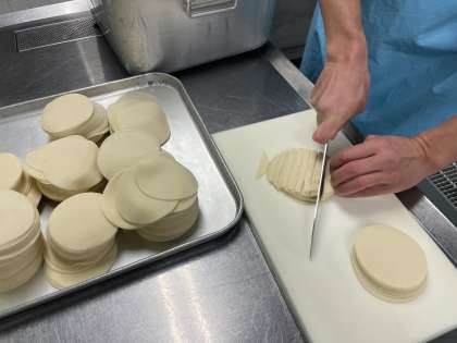 パリパリサラダの「パリパリ」は、ぎょうざの皮を1cm幅に切り、油で揚げています。ドレッシングのサラダの上に仕切りをつけ、サクサクのまま教室に届くようにしています。