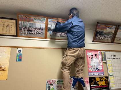 野球部の都大会出場記念パネルが届きました。主事さん方が丁寧に取り付けてくださいました。