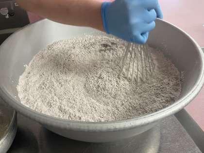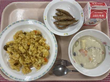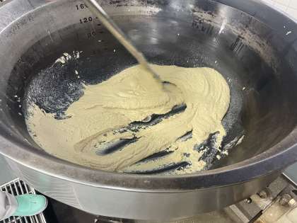 1枚目の写真は、さつまいもシチューのホワイトルゥを炒めて作っているところです。バターと小麦粉をじっくり炒めています。2枚目の写真は、魚にまぶす衣にスパイスを混ぜています。オールスパイスやガーリックパウダーを混ぜた衣なので、香りがよく、わかさぎがカリカリになるまで揚げているのでサクサク食べられて大人気でした。