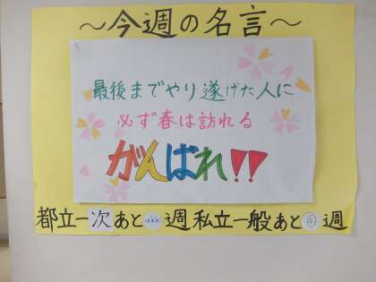 今週3年生は私立の一般入試に挑んでいます。実力が発揮できるようベストのコンディションで臨んでください。東京都の私立は2月10日、11日をメインに一般入試が行われます。この一番寒い時期に行われるので、1,2年生は風邪をひかない体調管理の練習をしてください。