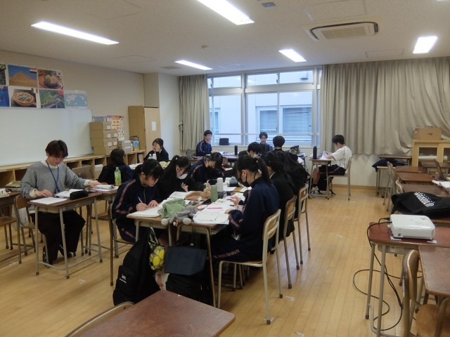 話さず静かに勉強する部屋(図書室)教えあいOKの部屋(視聴覚室)があります。