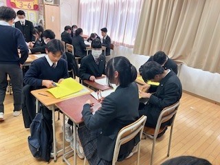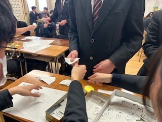 3年生公民では、貿易ゲームを行なっています。ゲームを通してこれまで学んできた世界の仕組み、課題を感じました。
