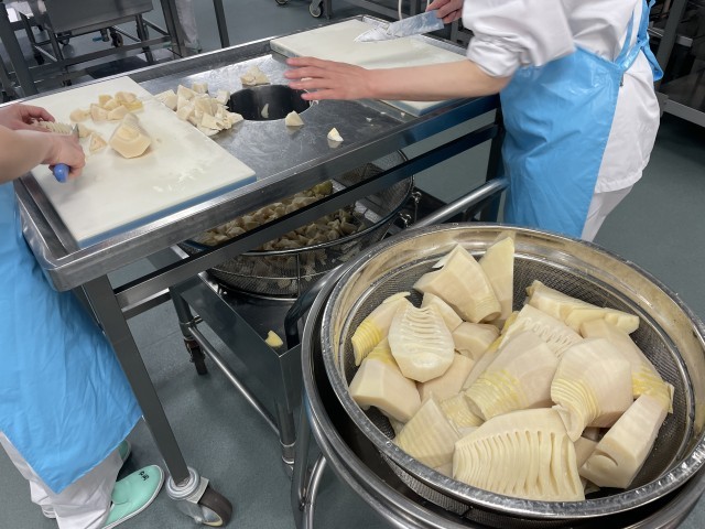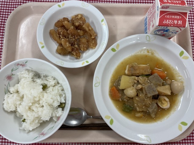 今日は旬の食材をたくさん使った給食でした。生のグリンピースや、新たけのこ、ふきやさやえんどうなど、春を味わいました。豆だけコロコロと残っているクラスもありましたが、よく食べてくれていました。