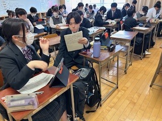 3年生歴史では授業のなかで数回のペアワークがあります。どの生徒も自分なりにまとめた歴史の流れを発表できています。