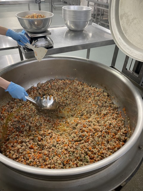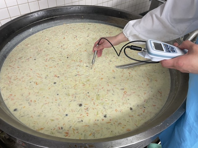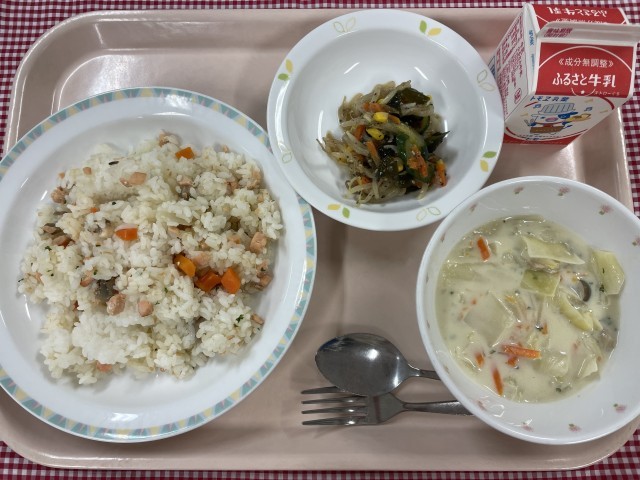 鮭ピラフは、ごはんに作った具を混ぜ込んで完成させています。クリームスープは旬のキャベツをたっぷり使い、鶏がらスープと牛乳で煮込み、ホワイトルゥでとろみをつけました。食缶の底がきれいに見えるくらい、よく食べてくれているクラスもありました!!