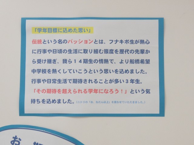 3年生の廊下に学年目標が掲示されました。対面式からしっかりとフナキボをリードしてくれている