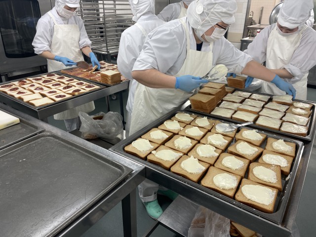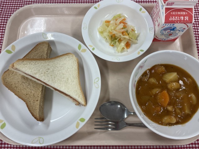サンドイッチは、いちごジャムもクリームチーズも食パンの端まできれいに塗ってくれています。どちらの味も大人気で、とてもよく食べてくれました。ビーンズシチューには白いんげん豆が入っています。2釜でたくさん作りましたが、モリモリ食べてくれました!!