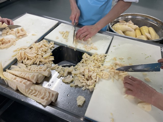 旬のたけのこは、八百屋さんが薪で沸かしたお湯で茹でてから納品してくださいました。新鮮なたけのこは味も香りもよく、絶品でした!!教室でもとてもよく食べてくれていました!!焼き魚は好みが分かれて、大喜びしている子もいれば、苦手で残している人もちらほらいました。まずは一口、チャレンジしてもらえたら嬉しいです!!