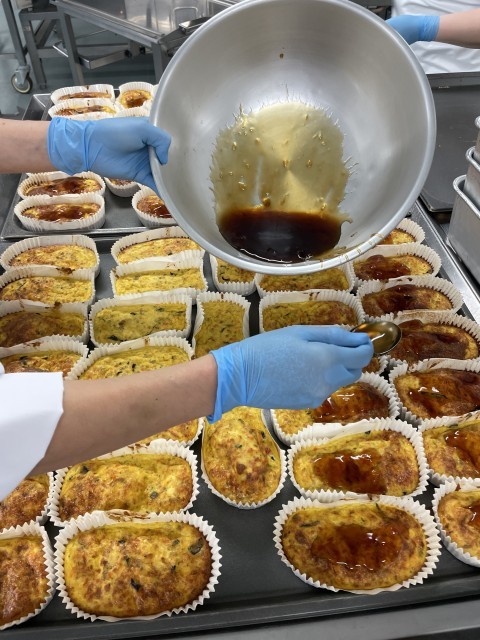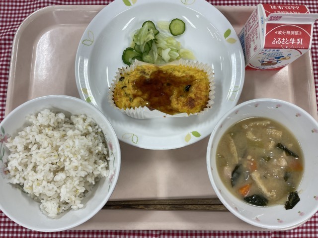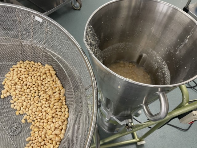 雑穀ごはんは、白米にあわ・きび・大麦を混ぜて炊き込みました。擬製豆腐は、崩した豆腐や豚肉・野菜などを炒め合わせ、あんかけをかけています。写真の大豆は、呉汁に入れるためにミキサーで細かくしているところです。