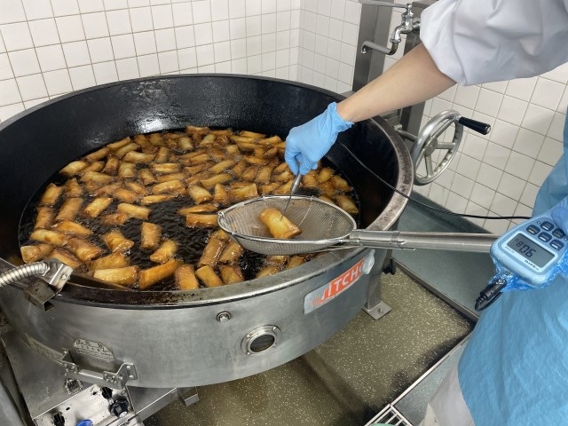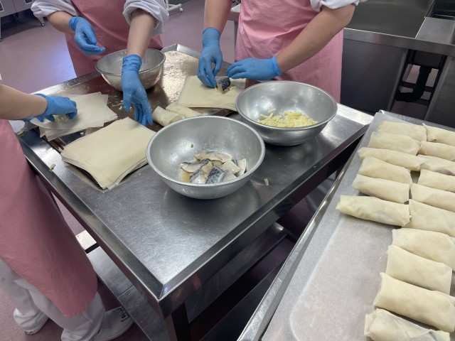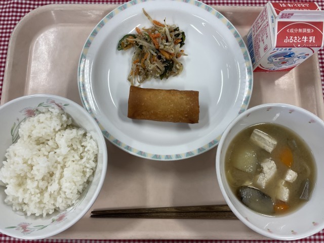 今日は春巻きの皮で魚とチーズを包み、油で揚げました。しっかりめの味付けでごはんが進みました。春巻きの中身が魚だと気付き、かじって残している人が思ったより多く、残念です。魚も残さず食べてもらえると嬉しいです。運動会に向けて3食しっかり食べて、暑さに負けない体を作りましょう!!