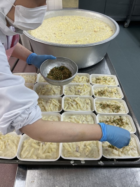じゃがいもをたっぷり使ったグラタンでした。とても量が多いので、タライを5つも使用しました。大人気でおかわりのじゃんけんがあちこちで繰り広げられていました。ひじきのビタミンサラダはあまり人気がありませんが、モリモリおかわりしてくれる子もいて嬉しいです。見た目だけで判断せず、まずは一口食べてみましょう!