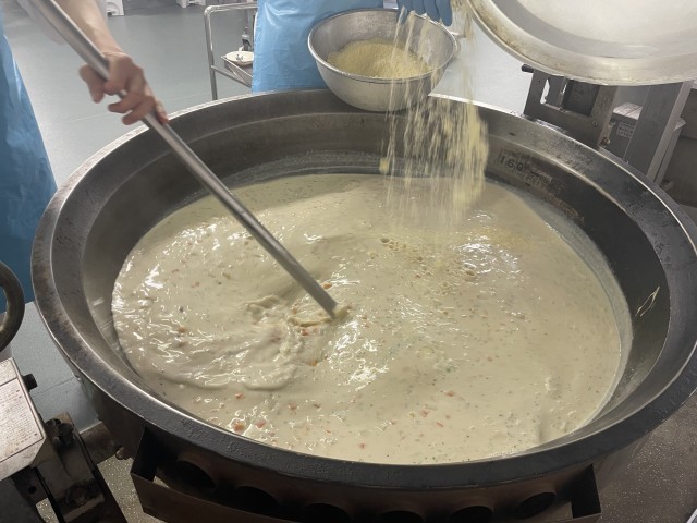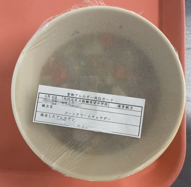 チャウダーは、仕上げに粉チーズを入れてコクを出しています。アレルギー生徒には、食材によって対応可能な献立の場合はアレルギー食材を除去したスープを作っています。