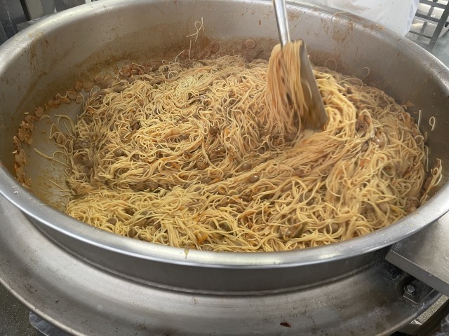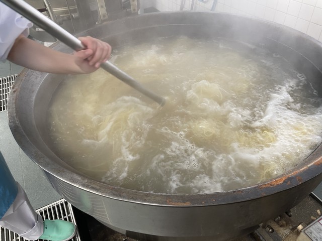 スパゲティナポリタンは、具と麺を一緒に炒め合わせています。麺は量が多いので、ひと学年すつ茹でて、具を絡めるのもひと学年ごとに合わせています。それでも釜がいっぱいになるくらいの量がありますが、みんなとてもよく食べてくれるので作り甲斐があります!!