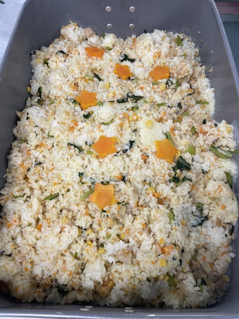 今日は七夕に合わせて七夕献立です。あちこちに星やそうめんの天の川、にんじんの短冊などを散りばめました。クラスで何枚かずつ出汁で煮た星形のにんじんをつけています。