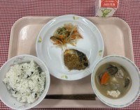 献立は、・わかめごはん・魚のごまだれかけ・こんにゃくサラダ・豚汁・牛乳です。魚の...