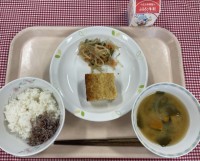 献立は、・有機米ごはん・さばの揚げ煮・からし和え・豆腐とわかめのみそ汁・牛乳です...