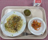献立は、・スパゲティ・ボンゴレ・キャロットラぺ・栗と小豆の抹茶ケーキ・牛乳です。...