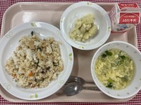 献立は、・担々麺風ピリ辛チャーハン・ペッパーチーズポテト・青菜と卵のスープ・牛乳...