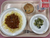 献立は、・スパゲティ地中海ソース・グリーンサラダ・ブルーベリーマフィン・牛乳です...