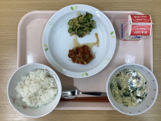 今日の献立・・・有機米のご飯、油淋鶏、中華和え、にらたまスープ、牛乳