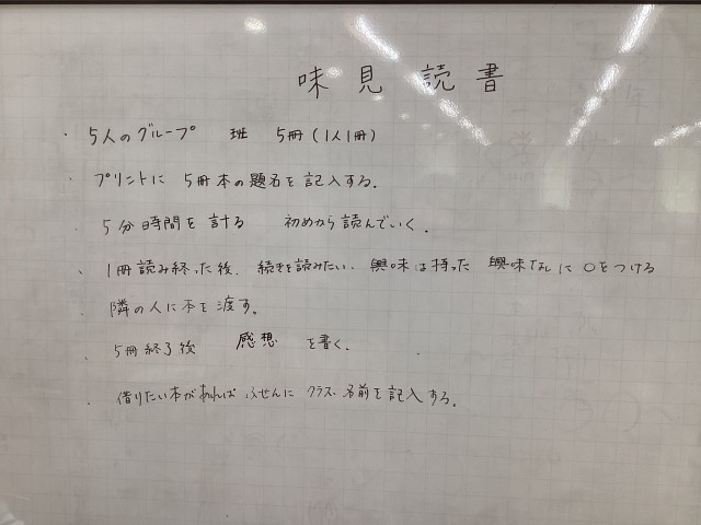 3年生は国語の時間に、図書館司書さんとのコラボ授業「味見読書」を行いました。5人のグループになり、友達が選んだ本をそれぞれ5分間読みます。「続きを読みたい・興味を持った・興味なし」などの印をつけ、5冊読み終わったら感想を書きます。自分では手に取らなかった本に出会える良い機会になったようです。また、友達の好きな本を知ることで、その人の新しい一面を知ることもできて楽しかったという感想もありました。誰もが集中して本を読んでいて、しーんと静まり返った図書室の雰囲気は静謐そのものでした。