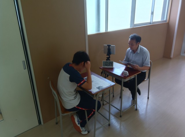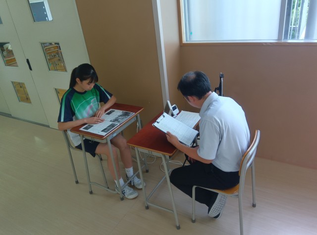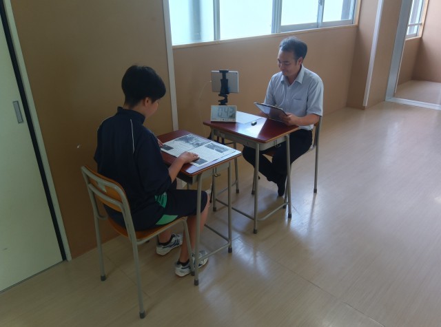 3年生の英語の授業では、ALTの先生の前で一人一人教科書の指定された一部分を読み上げる「読み」の゙テストを行っていました。みんな緊張しながらも一生懸命テストに臨んでいました!