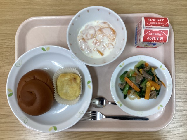今日の献立・・・ココアパン、じゃがいものタルト、焼肉サラダ、フルーツヨーグルト、牛乳