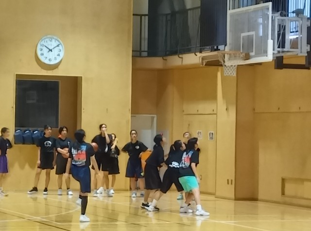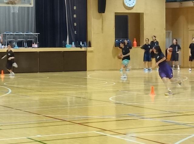 バスケットボール部女子は、バスケットボールに必要な走力やボール回しなどの基本練習を繰り返し行っていました。なんと、顧問の先生も生徒に負けじと走り込みをしています!