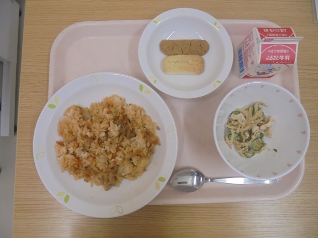 今日の献立・・・キムタクチャーハン、バンバンジー風サラダ、二種類ちんすこう、牛乳