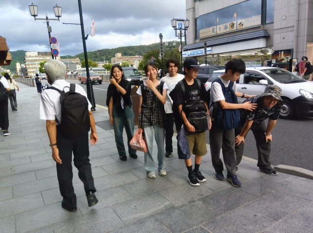 最後の版画家戻ってきて、全班到着チェック完了です。雨予報に反してほとんど傘いらずの班行動でした。代表生徒から宿舎の方々にご挨拶も行いました。お疲れ様でした!