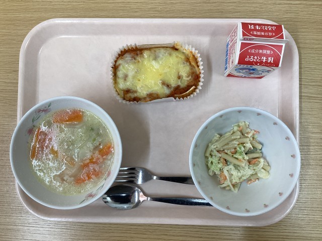 今日の献立・・・リゾット、ラザニア、マカロニサラダ、牛乳