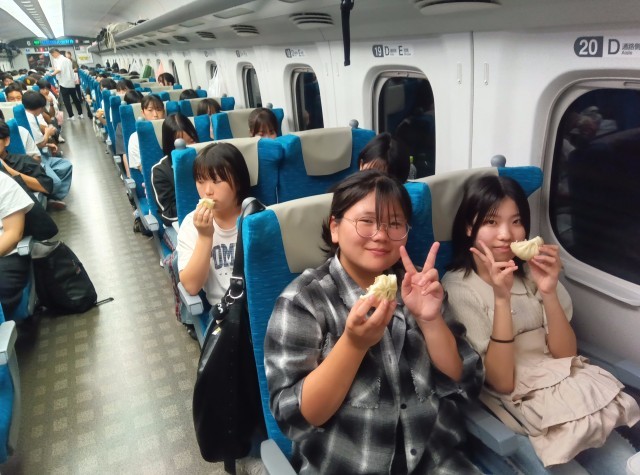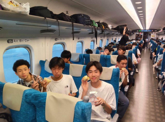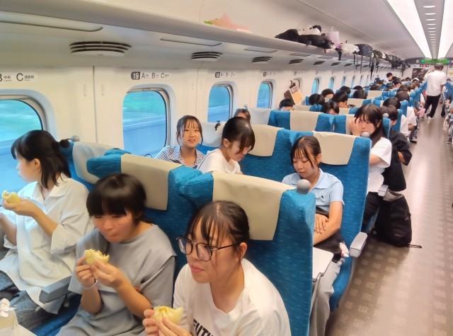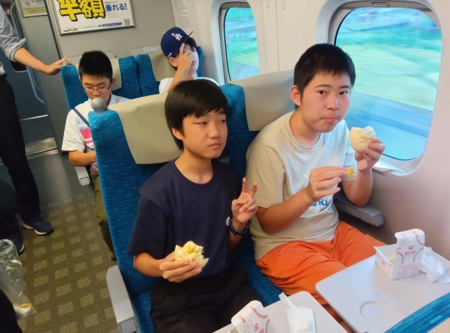 もうすぐ新横浜です。みんな肉まんをほおばっています。