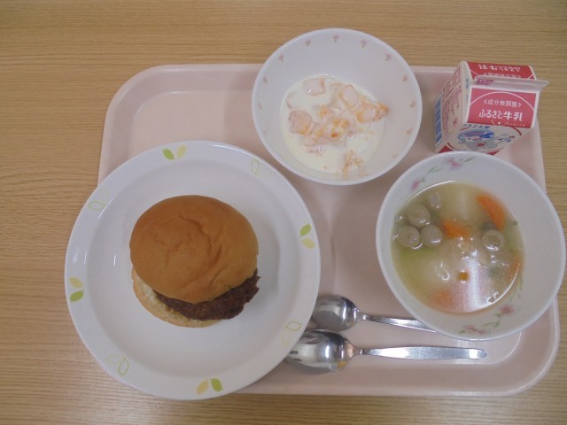 今日の献立・・・コロッケサンド、ABCスープ、フルーツヨーグルト、牛乳