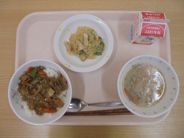 今日の献立・・・焼肉丼、春雨サラダ、トック入りスープ、牛乳