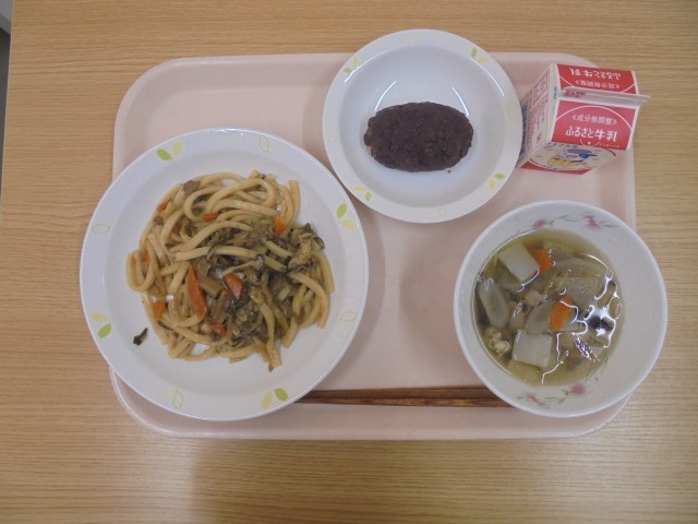 今日の献立・・・焼きうどん、かしわ汁、里芋おはぎ、牛乳