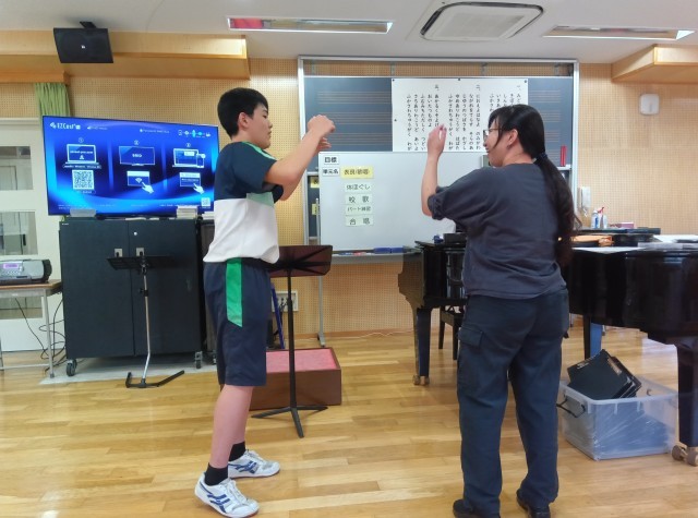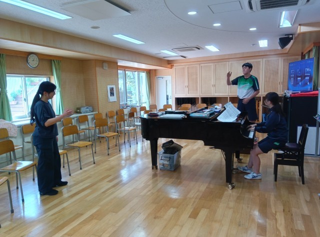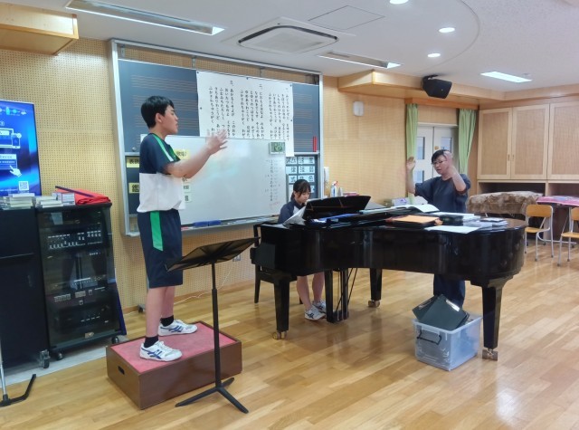 10月17日の合唱コンクールに向けて、昼休みの時間を使って、音楽科の先生が順番に指揮者と伴奏者の指導をしてくださっています。今日は、3年生の学年全体合唱の指揮者、伴奏者の練習日でした。美しいピアノの音色をリードするような、優しく力強い指揮でした。当日が楽しみです!
