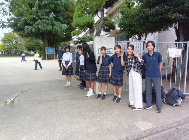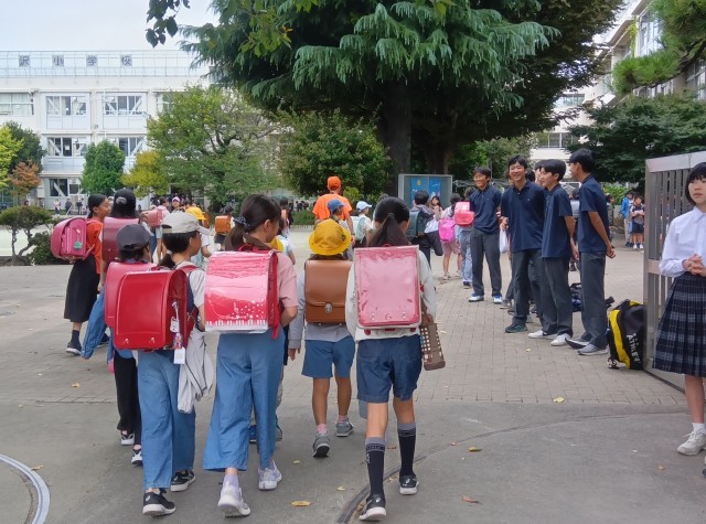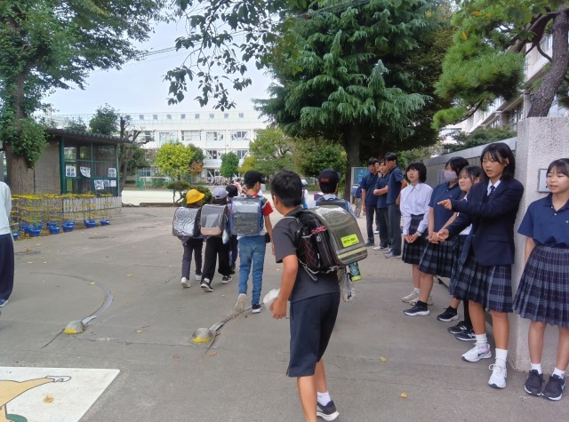 月に一度の「ふれあい挨拶」です。生徒たちは、クラスごとに自分の母校の小学校に行き、登校する児童に元気よく挨拶をします。「おはようございます!」
